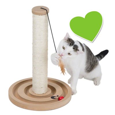 Wielofunkcyjny drapak dla kotów, z torem dla kulek, w zestawie 2 kulki, wykonany z wytrzymałego sizalu, drewniana kula z prawdziwymi piórkami na gumce dla dodatkowej zabawy, wymiary: wys. 43 x Ø 30 cm