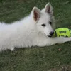 zachwycona żywotnością klasycznego produktu Konga zakupiłam coś z piszczałką. Mój pies uwielbia piszczałki, ale żadna zabawka z dźwiękiem nie przeżywa dłużej niż jeden dzień, bo przecież fajnie jak piszczy, ale trzeba jak najszybciej zlokalizować źródło dźwięku i unicestwić je.. Częściowe rozpracowanie tej zabawki zajęło jakieś 3 dni, tylko dlatego, że obserwowałam, kiedy przekraczana jest granica. Otoczka zabawki "ładnie" się ciągnie i odkleja i można spokojnie rozgryźć, odsłanianą od zielenią, plastikową piszczącą końcówkę. Niby zabawka jeszcze działa (pół łysa), ale myślę, że jej koniec to już kwestia kilku dni.